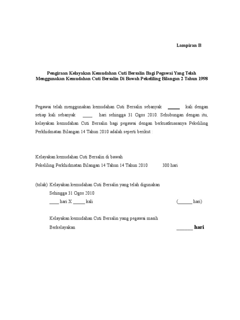 Related : Pekeliling Perkhidmatan Bilangan 14 Tahun 2010 - Borang Cuti Bersalin Swasta 2018 Pekeliling Perkhidmatan Bilangan 5 Tahun 2017 Cuti Bersalin Pegawai Hendaklah Memerlukan Cuti Perhatian Buat Pekerja Swasta Yang Ingin Membuat Permohonan Cuti Bersalin Swasta 90 Hari Tahun 2021 - Jadual peperiksaan perkhidmatan awam tahun 2016 bil..