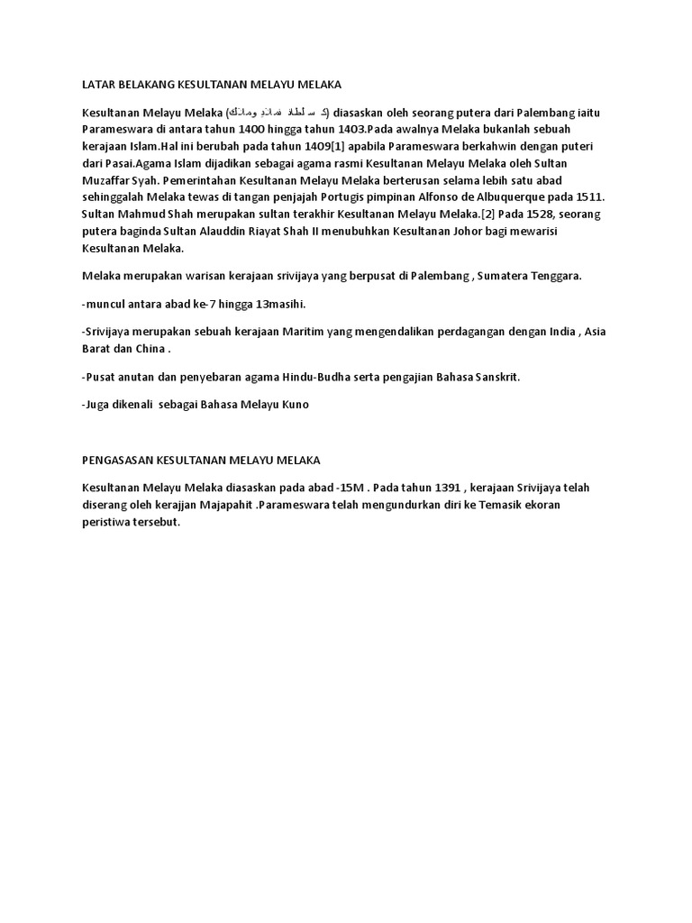 Parameswara merupakan seorang putera raja palembang, sumatera yang beragama hindu. Melayu melaka fokus 2 pengasasan kerajaan melayu yang tua dan kerajaan melayu baru fokus 3 warisan kesultanan melayu melaka dalam pentadbiran, perundangan, kegiatan ekonomi dan sosiobudaya fokus 4 latar belakang sejarah sarawak sebab dan akibat langsung kesinambun gan warisan kesultanan melayu Salinan sistem pentadbiran kesultanan melayu melaka (sejarah bab 5 tingkatan 2) kuiz rancangan mainan. Culture and social changes of the baba nyonya community in malacca, malaysia tieng wei. Hal ini berubah pada tahun 14091 apabila parameswara berkahwin dengan puteri dari pasai.